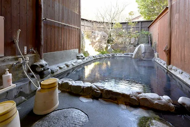 湯布院の名湯に浸かって、旅の疲れをリセット。貸し切り風呂でのんびりと湯に浸かります。