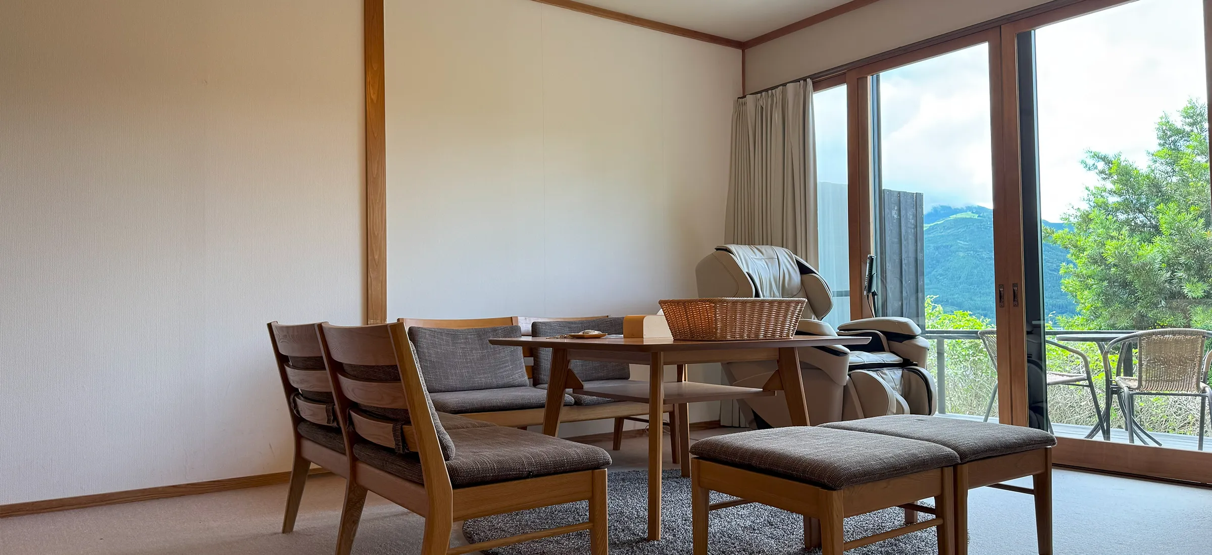 - 由布岳を望む開放感あふれるロケーションに佇む、和の落ち着きとスタイリッシュさが調和した客室。